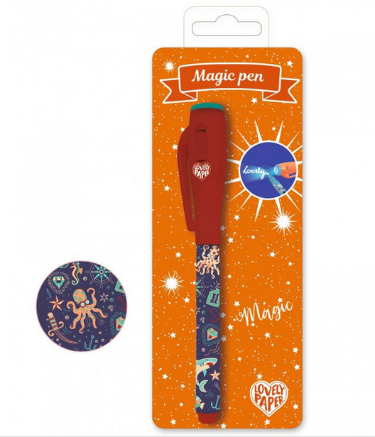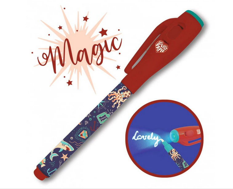 Magické pero s neviditelným inkoustem, které lze vidět pouze s pomocí UV světla. UV světlo je zabudované ve víčku pera, baterie jsou součástí balení.