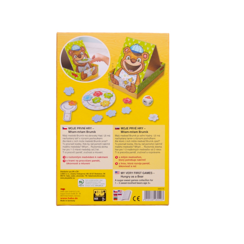 Hra Mňam-mňam Brumík pro děti od 2 let posiluje paměť, dovednost a jazykové schopnosti, je určena pro 1 až 3 hráče.