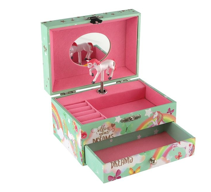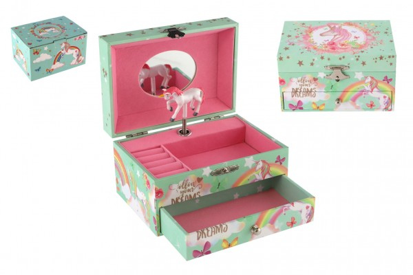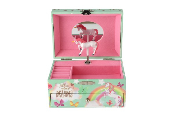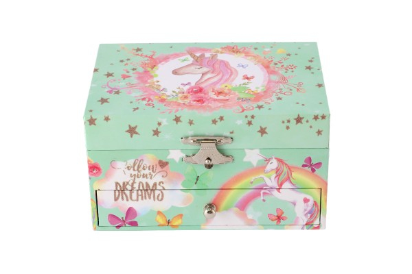 Tato kazeta s hrací skříňkou je stylizovaná na šperkovnici a bude ideálním místem pro uložení pokladů každé dívky. Kazeta je vyrobena z odolného kartonu v pastelově zelené barvě, a je zdobena hvězdami a motivem jednorožce, což z něj dělá ideální doplněk pro dětský pokoj.