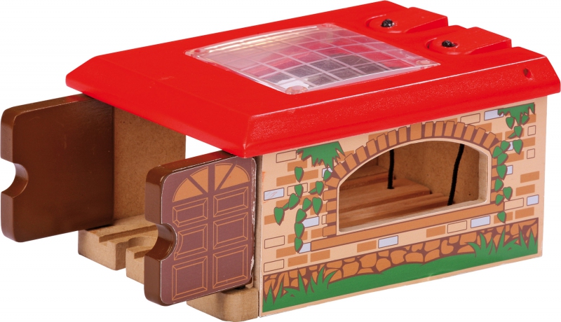 Barevné železniční depo ukryje před nepříznivým počasím a v době volna jeden vláček. Je krásným doplňkem hry s vláčky.