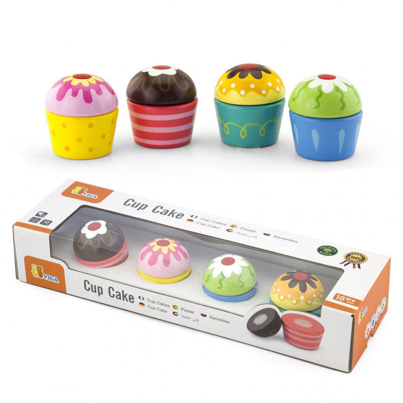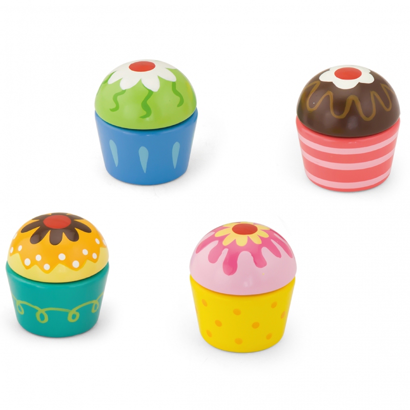 Sladké dortíčky v krásných a sytých barvách jsou skvělým doplňkem dětských kuchyněk a obchůdků. Horní část dortíků drží pomoci suchého zipu, děti si mohou dortík "rozkrojit" na dvě části.
